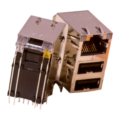 这些产品包括带有集成以太网磁性的单端口 RJ45 连接器和双 USB A 型连接器。